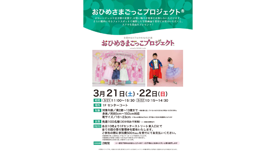 3/14(土)&3/15(日)はららぽーと海老名でプリンセスや王子さまに変身できるおひめさまごっこプロジェクト®!ドレス姿でお買物やお食事を楽しんで、優雅なプリンセス気分を体験!おひめさまやおうじさまに変身して、館内を自由に散歩しよう!3/14(土)&3/15(日)はららぽーと海老名でプリンセスや王子さまに変身できるおひめさまごっこプロジェクト®!ドレス姿でお買物やお食事を楽しんで、優雅なプリ…