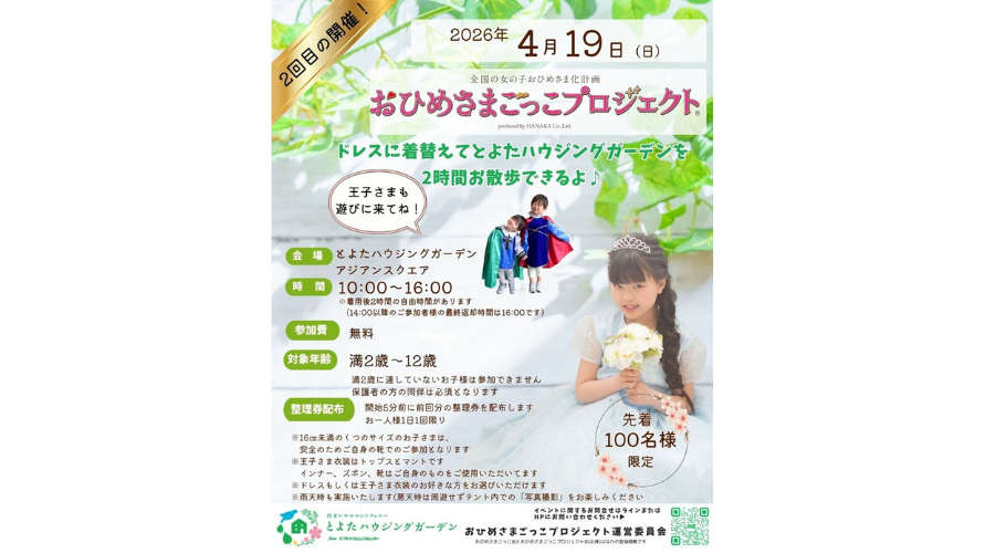 4/19は愛知県「とよたハウジングガーデン」でおひめさまごっこプロジェクト(R)4/19は愛知県「とよたハウジングガーデン」でおひめさまごっこプロジェクト(R) ドレス・靴・ティアラでおひめさまになっちゃおう! 王子さまの衣装もあるよ! ド…