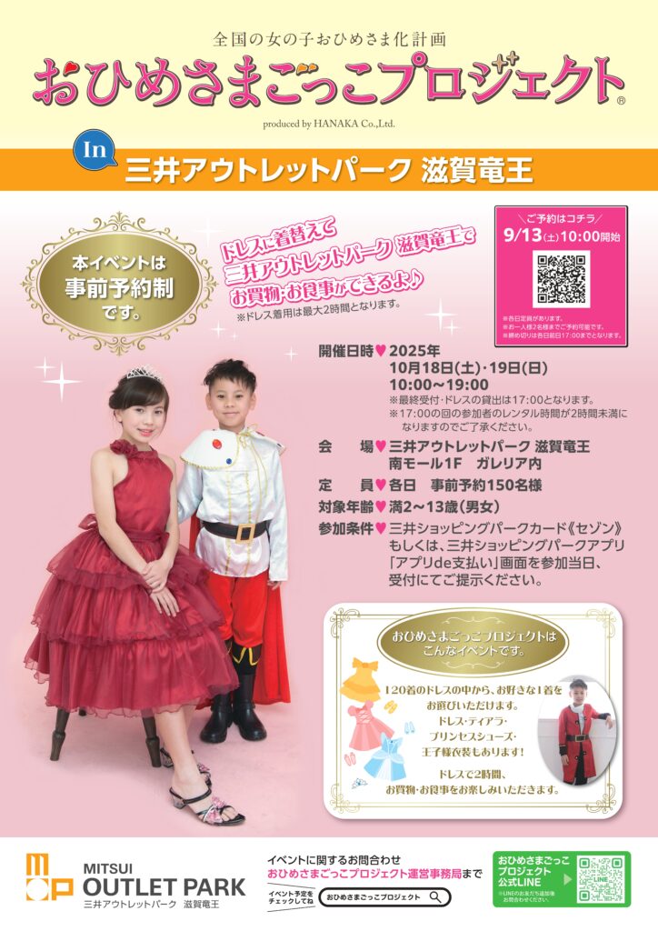 10月18日(土)-19(日) は 三井アウトレットパーク 滋賀竜王 でプリンセス体験! かわいいドレスを着られる「おひめさまごっこプロジェクト®」